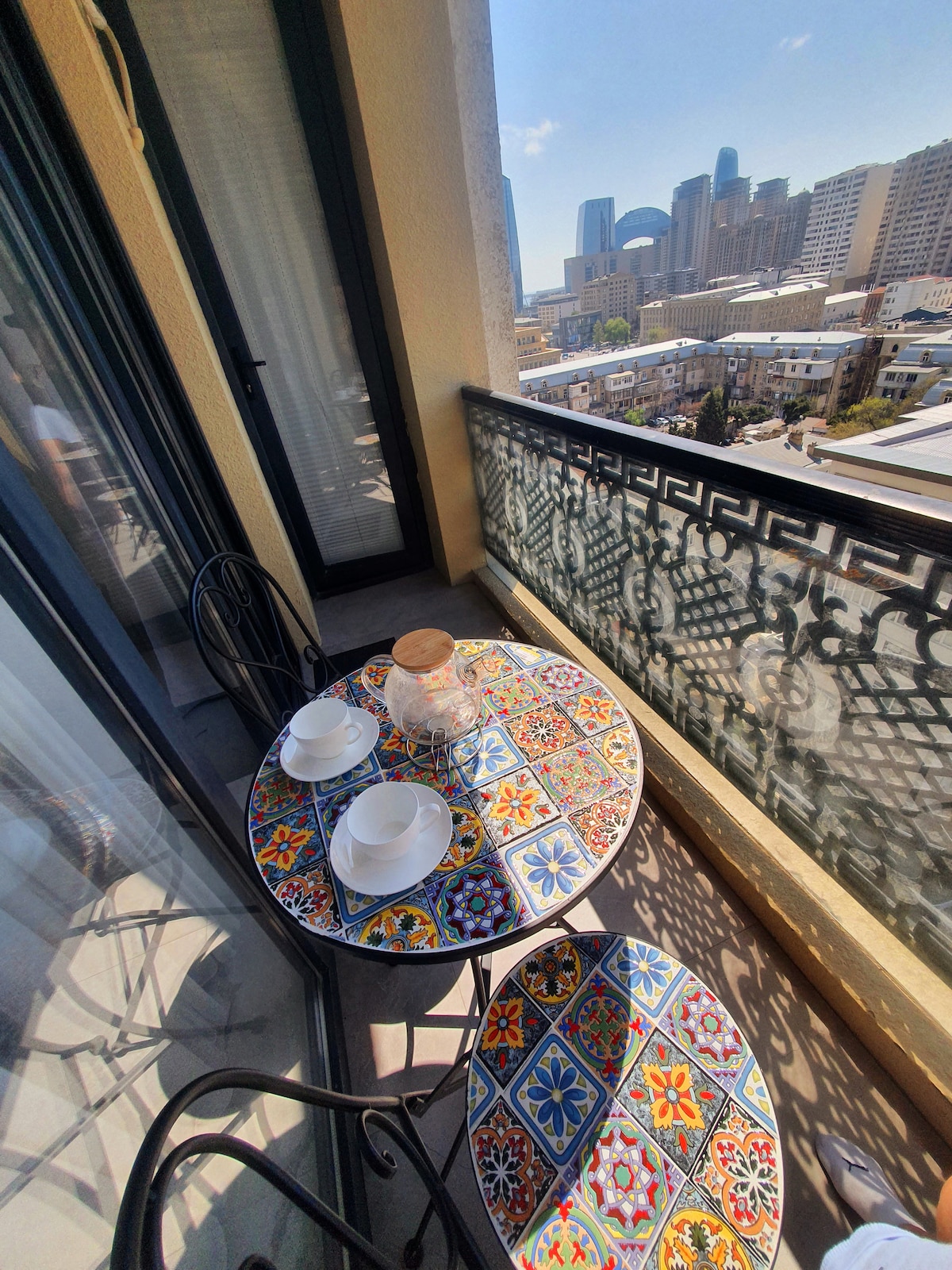 Matatagpuan ang apartment sa sentro ng lungsod. 10 -15 minutong lakad ang layo nito papunta sa Lumang lungsod, ang Crystal Hall. Matatagpuan ang bahay sa isang mataas na pamantayang tirahan na napapalibutan ng supermarket, fitness center, iba 't ibang restawran at bar. Ang mismong apartment ay may tanawin ng DAGAT, bago at nilagyan ng lahat ng premium na kagamitan na kinakailangan para sa pamumuhay. Kabilang dito ang washing machine, iron, air conditioner, TV at marami pang iba. Sigurado akong magiging mainam na lugar ito para sa mga mag - asawa o kaibigan na nagbabakasyon sa Baku.