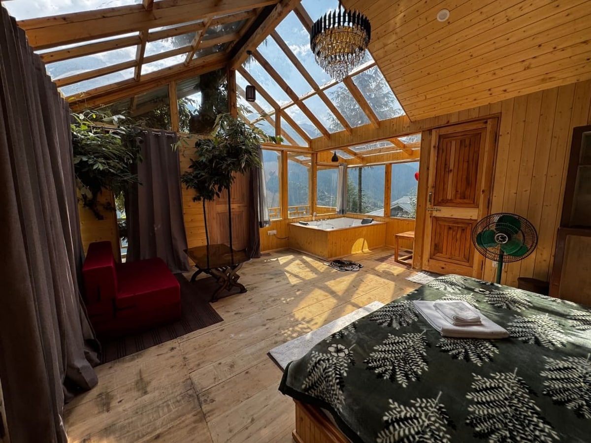 Beautiful Wooden Jacuzzi Glass House with valley views, centrally located near the market, popular cafés, and waterfall — perfect for a peaceful getaway. # Spacious Master Bedroom # Private Jacuzzi with Valley View # Power Backup # Free Wi-Fi # Bonfire Area # In-House Food Service # Surrounded by Nature # Free Parking Space Please Note: -There is 50mtrs Walk from the parking spot to the property. we will pick your luggage. Breakfast, meals,room heaters, bonfire exclusive of stay price here