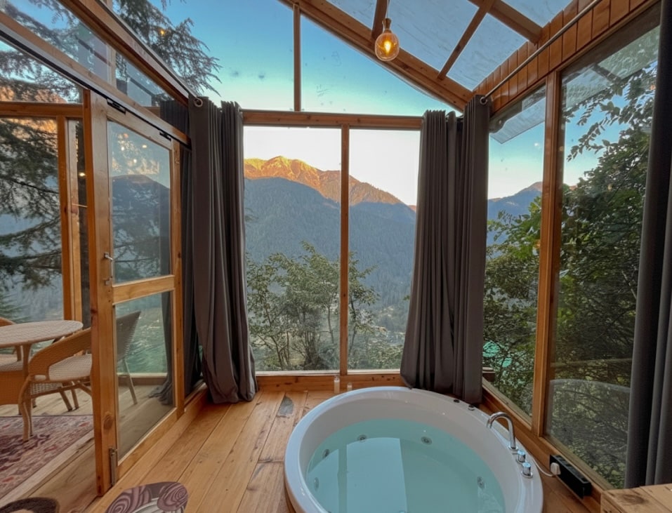 Damhin ang perpektong timpla ng kalikasan at opulence, na nakatirik sa ibabaw ng burol ng Tandi malapit sa Jibhi. Masiyahan sa isang marangyang magbabad sa mainit na bubble bath habang sarap na sarap sa mga nakamamanghang tanawin nang direkta mula sa iyong bathtub. Malayo sa kalsada at ingay ng trapiko, ang tanging mga tunog na makikita mo ay ang melodic na huni ng mga ibon. Sa isang all - glass cabin, maaari mo ring makita ang isang lumilipad na ardilya o masulyapan ang isang shooting star sa tahimik na kalangitan sa gabi. Magrelaks at mag - enjoy sa katahimikan ng makisig at mapayapang bakasyunan na ito.