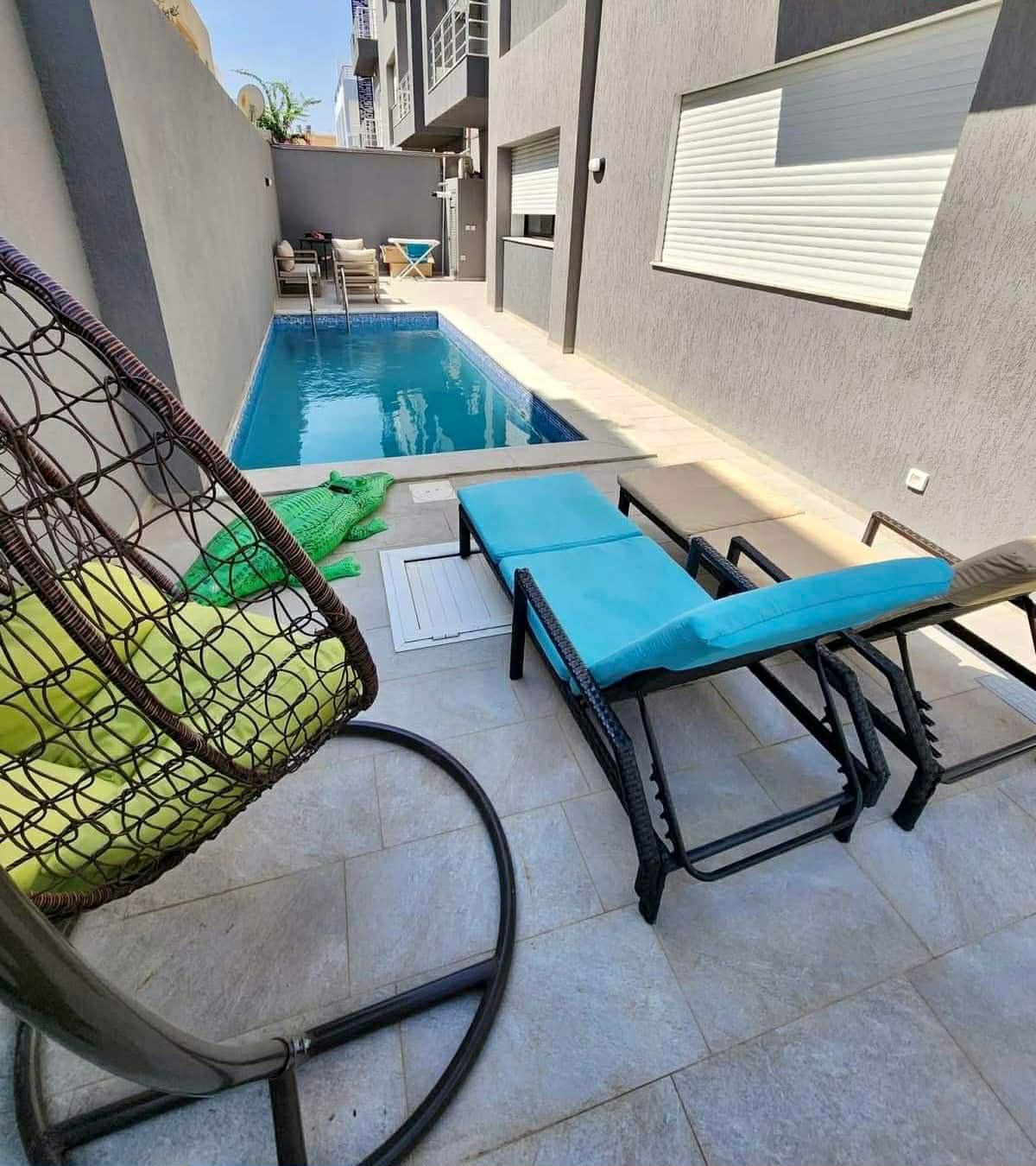 Maligayang pagdating sa Dar Lily 🏡 Maluwang na 680 m² na villa na pinagsasama ang modernong disenyo at ganda ng arabesque ✨ May magandang lokasyon sa tahimik at ligtas na kapitbahayan sa Hammamet North 📍5 minuto lang mula sa The Sindbad Hotel at 5 minuto mula sa mga beach 🏖️, restawran 🍴, at tindahan. 35 minuto mula sa Enfidha Airport at 55 minuto mula sa Tunis Carthage International Airport. Nagtatampok ng 4 na eleganteng suite at pribadong 9×3.5 m na pool na 🏊‍♂️ Dar Lily ang perpektong bakasyunan para masiyahan sa kaginhawaan, estilo, at hindi malilimutang mga alaala kasama ng mga mahal sa buhay.
