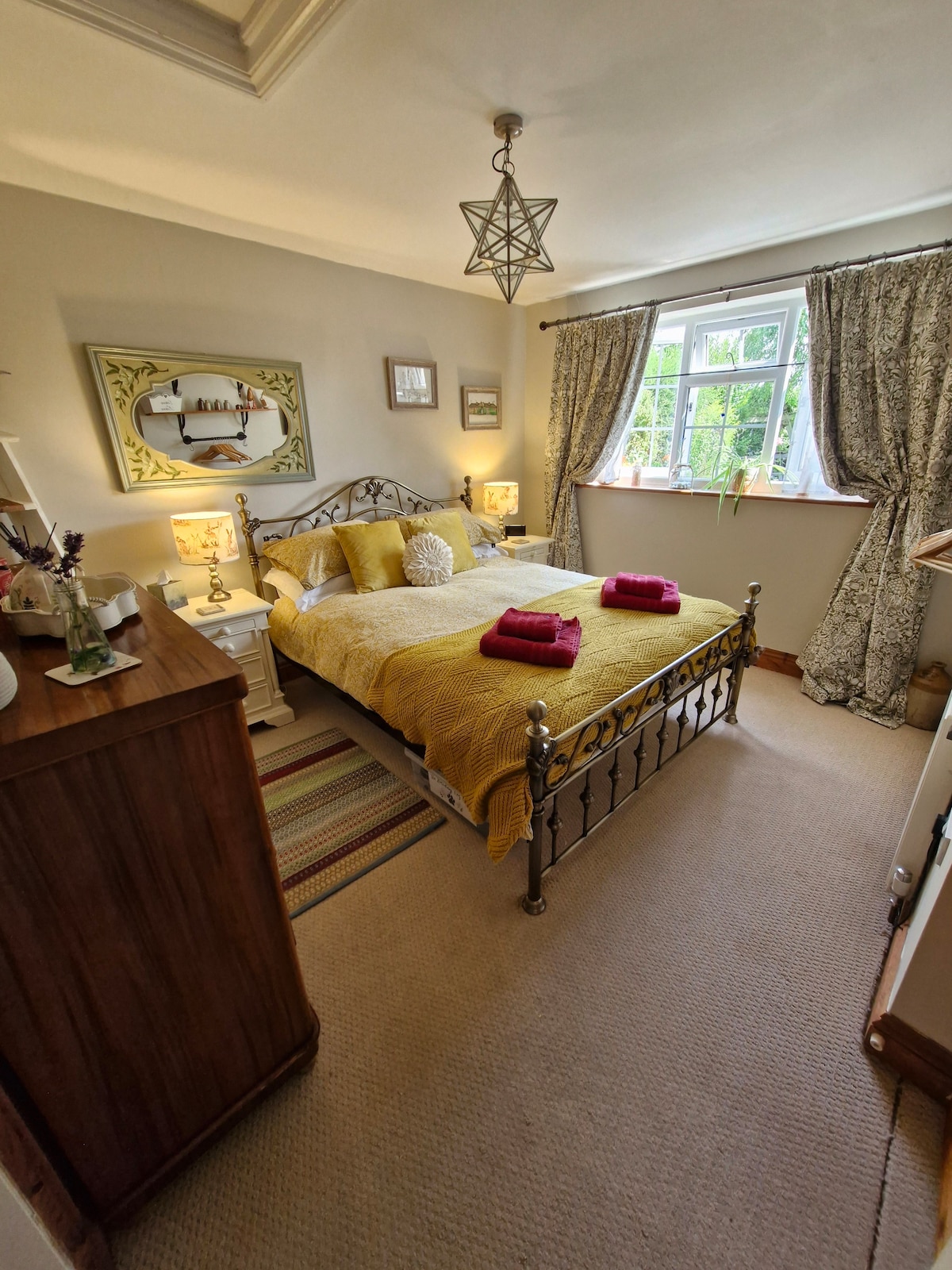 Self contained annexe with minimal cooking facilities - downstairs open plan kitchenette with microwave and hob, lounge area (TV/dvd player), dining area. Upstairs in master bedroom king size bed sloping attic roof - separate shower room with toilet and wash handbasin. Second bedroom (request booking please) single bed, sloping roof. Outside toilet and fridge if required. Welcome pack for your first breakfast. Kitchen facilities suitable for breakfast and light lunches.
