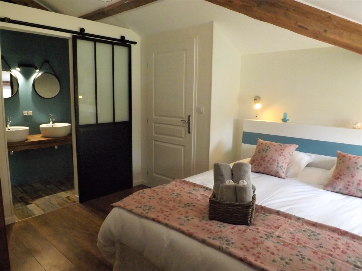 Halika at manatili sa komportableng kuwartong ito ng "Villa the Paradise" ** Mga Kuwarto , para sa trabaho, pagrerelaks, turismo. Kalmado ang kapaligiran sa Val de l 'Eyre at ang cocooning ng pabahay. Huwag mag - atubiling humingi ng matamis at/o masarap na almusal na may maliit na bayarin bago ang iyong pagdating 6 na euro bawat tao. Pansinin ang pinainit na ⛔️ pool mula sa simula ng Mayo hanggang Setyembre, depende sa lagay ng panahon na inaasahan naming kanais - nais , napakataas na gastos sa heat pump.