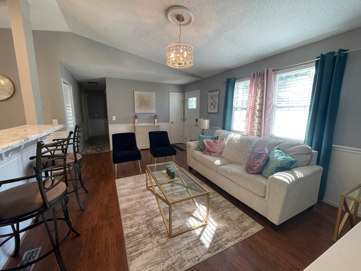 Matatagpuan ang isang lakad mula sa Newberry College ay ang chic bungalow na ito na pinagsasama ang mga modernong finish na may rustic, boho charm. Sa loob ng bagong ayos na tuluyan na ito, ituring ang lahat ng amenidad na may dalawang higaan, couch, love seat, at malaking sectional, washer/dryer, tv, kusinang kumpleto sa kagamitan at marami pang iba. Sa labas, tangkilikin ang pribadong bakuran, beranda sa gilid at likod na beranda na may grill at fire pit. Escape ang magmadali at magmadali sa tahimik na kapitbahayan na ito na isang lakad ang layo mula sa mga aktibidad para sa lahat.