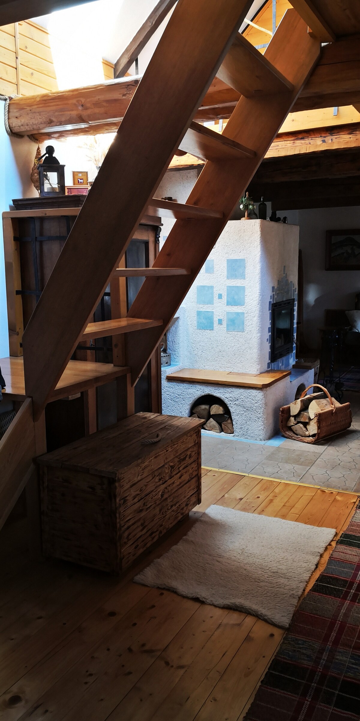 Ang dalawang - storey na loft na may hiwalay na pasukan ay nilikha sa pamamagitan ng pag - convert ng shop ng kahoy sa orihinal na studio ng arkitekto (46 m2) Ang lahat ng mga kama ay nasa isang karaniwang bukas na espasyo. Sa itaas ay double bed, sa ibaba ay sofa bed. Ang tuluyan ay kusinang may kumpletong kagamitan, kumpletong banyo na may toilet at shower. Ang heating ay ibinibigay ng mga de - kuryenteng foil nang direkta sa mga luwad na plasters at isang natatanging 100 - taong Norwegian cast iron furnace (sa taglamig, ang mga kliyente ay dapat magpainit ng handa na kahoy )