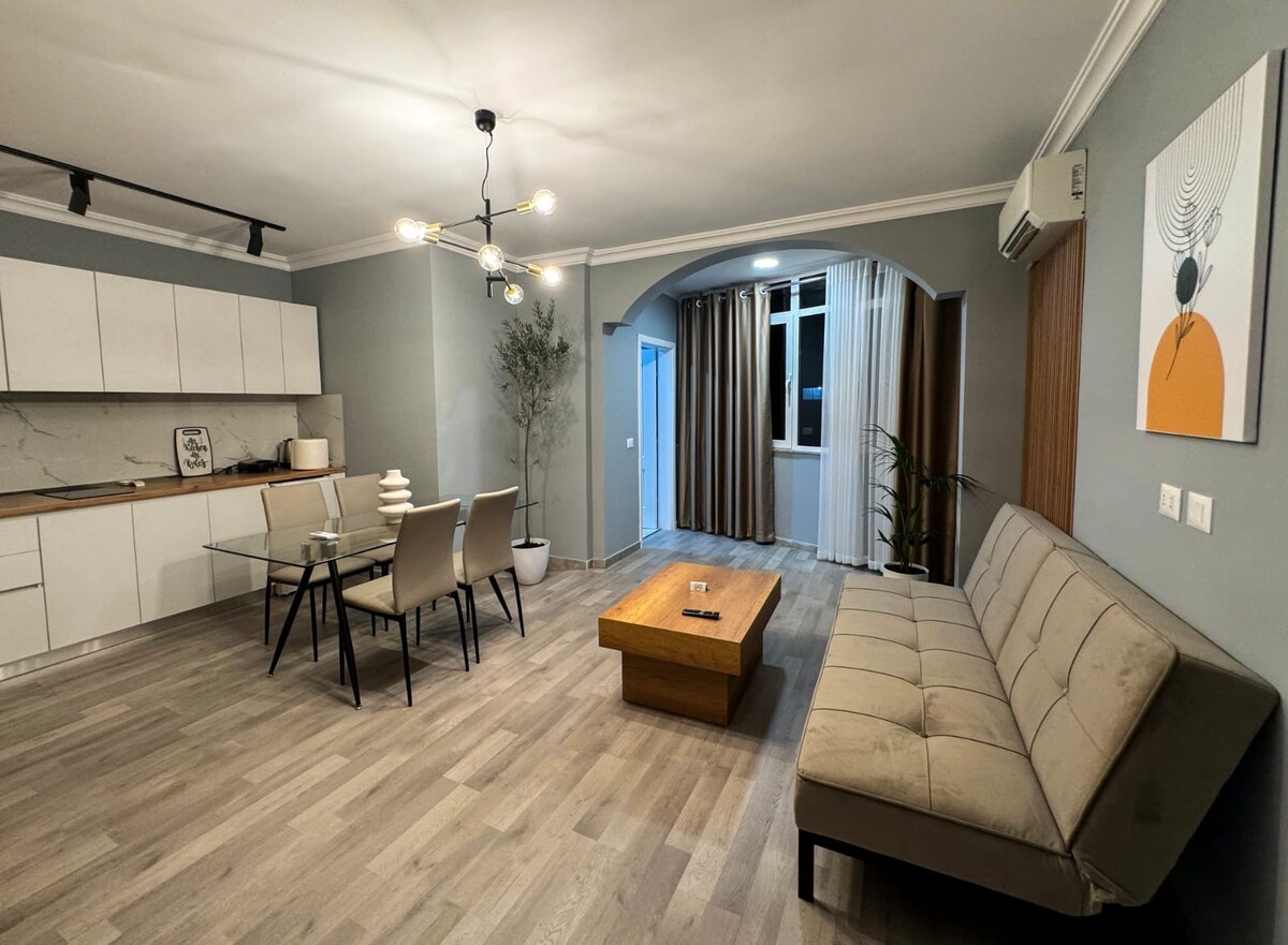 Maranasan ang kasaysayan at modernong kaginhawaan sa aming nangungunang apartment na matatagpuan sa iconic na gusali ng Shallvaret. Matatagpuan sa gitna ng Tirana, ilang hakbang ka mula sa mga sikat na bar at dapat bisitahin na atraksyon. Masiyahan sa privacy habang namamalagi sa pulso ng lungsod. May mga nakakabighaning tanawin mula sa ika -12 palapag, perpekto ang aming maluwag na balkonahe para sa kape sa pagsikat ng araw o alak sa paglubog ng araw. Malapit sa Tajvani, sumipsip ng lumang - mundo na kagandahan ng lungsod mula sa pinakamataas na punto ng mga unang gusali ng Tirana. Naghihintay ang iyong santuwaryo sa lungsod!