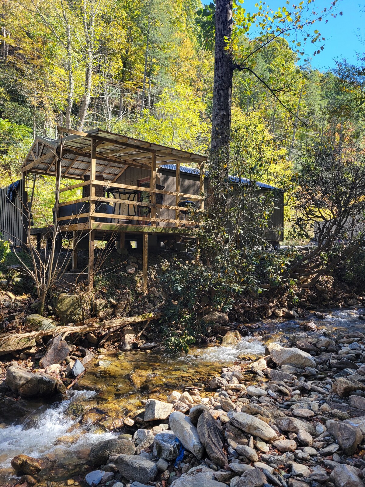 Our newest of 5 Airbnbs is complete! Stunning tiny cabin located in the Smoky Mountains of Flag Pond,Tn hovering a bold stream w huge deck and private hot tub! Both, Asheville and Johnson City just 30 min away w restaurants, breweries, nightlife and live music. Catering to outdoor Enthusiast with great hiking, waterfalls, ziplining, whitewater rafting/tubing, rivers,fishing and snow skiing/tubing just 15 min away OR Relax in your hot tub or by a bonfire with your favorite cocktail and tunes!