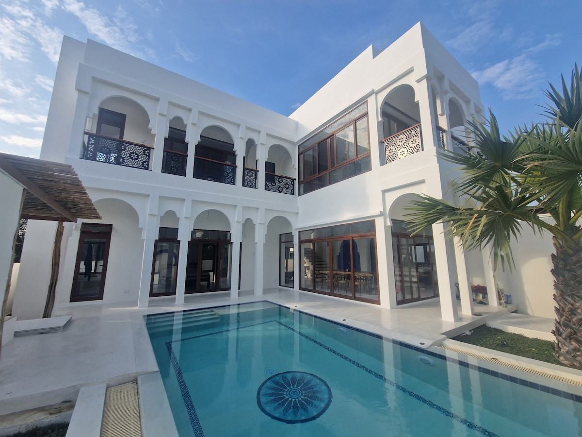 Modern Beachfront Villa na nagtatampok ng matataas na kisame, pribadong pool, direktang access sa beach, 525 sqm sa dalawang kuwento +roof top/garden. Ensuite master - br, 2nd br ensuite - parehong w/king - sized bed/walk - in closet. 3rd ensuite br w/malaking queenbed + 2 single bed. 8. Very comfortable ang tulog ko. Sa kaso ng mas malaking grupo ang TV room ay natutulog ng 6 na bata/matatanda depende sa pagiging malapit. 1 pang tao ang maaaring matulog sa sofa ng sala. 5 simpleng fold - out na kutson na available. Ang max total sleepers ay talagang 16 -20.