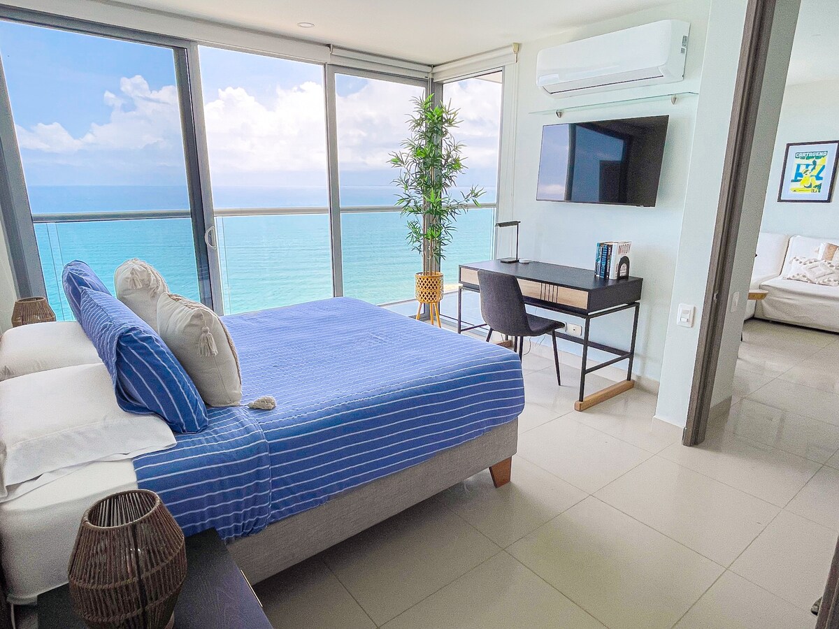 Perpektong lugar para maranasan ang luho at katahimikan sa Cartagena. Nag - aalok ang aming suite ng natatanging upscale na kapaligiran na may mga tanawin sa tabing - dagat ng kahanga - hangang Karagatang Caribbean. Idinisenyo ang aming yunit para sa mga bisitang naghahangad na masiyahan sa perpektong kombinasyon sa pagitan ng Zen at High Living vibes. Pakinggan ang splash ng mga alon kapag nagising ka at kapag handa ka na para sa isang malalim na pagtulog. Nagtatampok din ang modernong gusaling ito ng mga nangungunang amenidad sa sining tulad ng Gym, Jacuzzi at sikat na Infinity Pool na may mga nakamamanghang tanawin