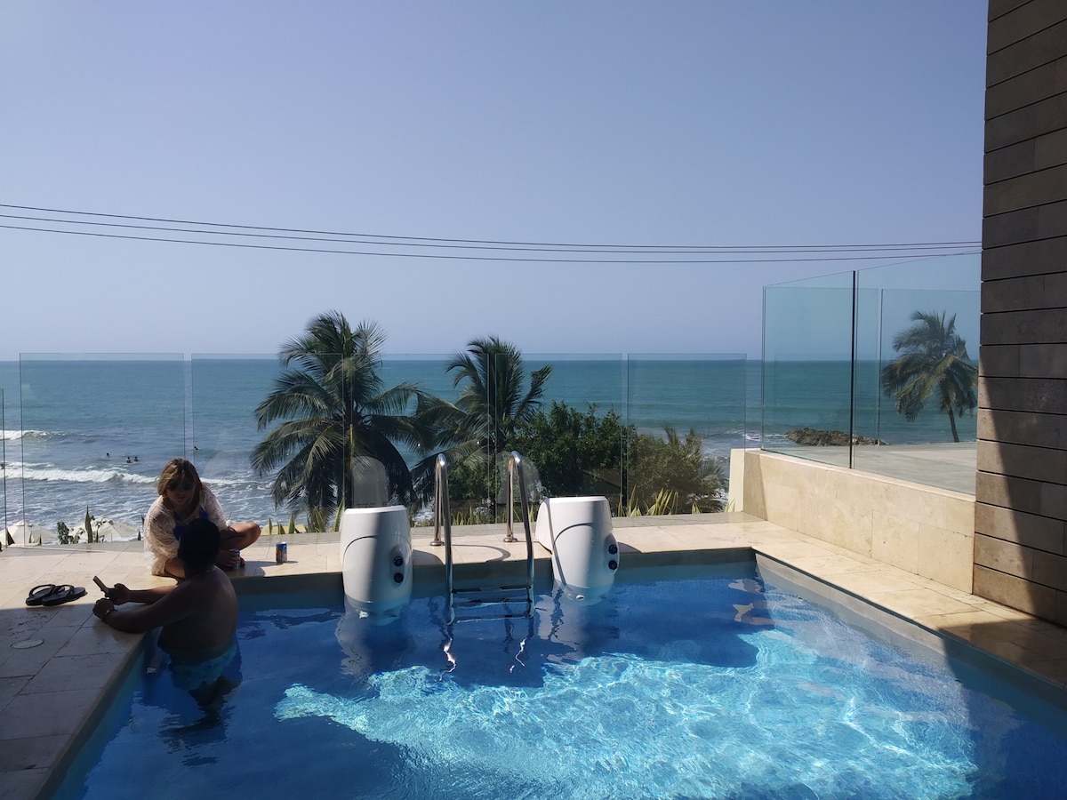 - Magandang tanawin ng dagat at may pader na tanawin ng lungsod - Kumpleto sa gamit -100% ligtas - Room + sala + balkonahe -2 banyo na may mga independiyenteng shower (mainit na tubig) - A/C sa bawat kuwarto - Wi - Fi -2 TV 4K - Maayos/huli na flight? Nag - iimbak kami - makatwirang - bagahe nang libre (magtanong nang maaga) - Swimming Pool at Jacuzzi - Washing/Drying Machine - Direktang access sa beach - Libreng paradahan -24/7 na seguridad - Malawak na mga karaniwang lugar -20 minutong lakad papunta sa Walled City - Kung wala kang alam tungkol sa Cartagena, gabayan kita !