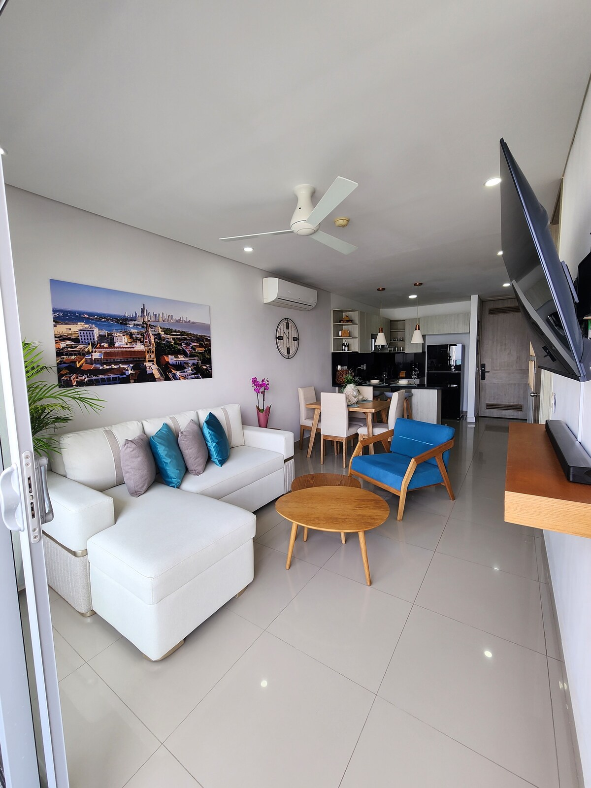 Maliwanag, bago at mahusay na nilagyan ng ganap na tanawin ng dagat at bahagya sa baybayin. Matatagpuan sa distrito ng Bocagrande, gusali ng H2, sa shopping center ng Plaza Bocagrande, ika -25 palapag. Malapit lang sa napapaderan na lungsod. Binubuo ang apartment na ito ng 3 kuwarto, 3 banyo, sala, panlabas na silid - kainan, kumpletong kusina, labahan, Infinity Pool, pool para sa mga bata, 3 jacuzzi, steam room, sauna room, bagong gym, business center, meeting room, banyo at social area.