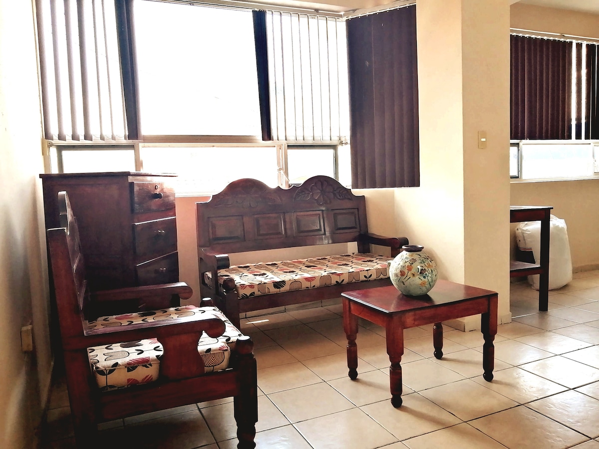 Madiskarteng matatagpuan ang Aruba sa gitna ng Tuxtla Gutiérrez, na nag - aalok ng komportable at naa - access na pamamalagi sa unang palapag, sa pampang mismo ng bangko. Bagama 't puwedeng tumanggap ang apartment ng hanggang 5 tao, espesyal itong idinisenyo para mag - alok ng maximum na kaginhawaan sa 4 na tao, na nagbibigay ng matalik at magiliw na kapaligiran. Mayroon itong dalawang kuwartong may mga double bed, na ganap na naka - air condition, na tinitiyak ang kaaya - ayang pamamalagi sa anumang oras ng taon.