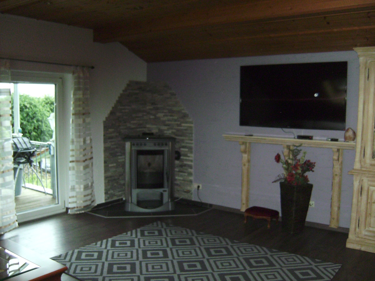 Ang chalet, na bagong itinayo sa konstruksyon ng kahoy, ay nakumpleto nang may labis na pagmamahal para sa detalye noong Marso 2024. Itinayo sa modernong estilo, nakakatugon ito sa pinakamataas na masigla Mga rekisito. Ang daanan mula sa iyong sariling paradahan, sa pamamagitan ng bahay, hanggang sa takip na beranda na may bago at de - kuryenteng pinainit Idinisenyo ang hot tub sa ground level. Sa loob, puwede mong gamitin ang kalan na nagsusunog ng kahoy at gawing komportable ang sarili mong sauna (libre). Ang pambansang daanan ng bisikleta sa parke na may magagandang hiking trail ay nasa maigsing distansya.