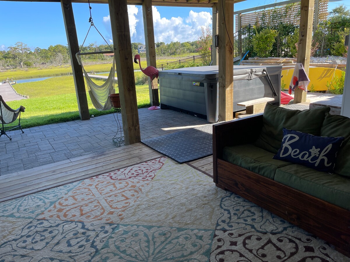 If you are an artist, fisherperson, kayaker, boater or just someone who wants to chill, you will love this. It’s quirky, private, artsy and has soul to refresh yours. Our waterfront paradise sits on a point on Queens Creek with a 180-degree view of the quarter-mile-wide estuary, just upriver from the Intracoastal Waterway and 5 miles from the ocean. We’ve rehabbed a 1959 fishing cottage, 2 bed, 2 bath surrounded by glass w/ kitchen and living facing the water.