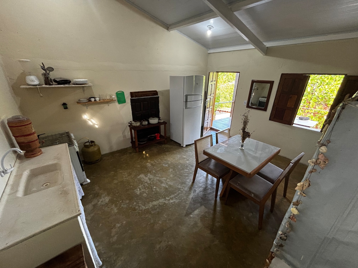 Ang chalet ay may kusina, banyo, at mesanine na may double mattress at fan. Ang chalet ay 100% recycled na kahoy. Boipeba dahil ito ay isang lugar na may kalapit na kagubatan, dala - dala namin ang kinahinatnan ng pagkakaroon ng pakikitungo sa maraming lamok. May kulambo at bentilador din ang cottage. Ngunit dahil ito ay isang chalet na may mga puwang, inirerekomenda na gumamit ng repellent kapag ikaw ay nasa kusina at pati na rin sa duyan. Ang SHOWER AY HINDI ELECTRIC. Payagan ang iyong sarili at maging bukas sa mga bagong karanasan. ✨