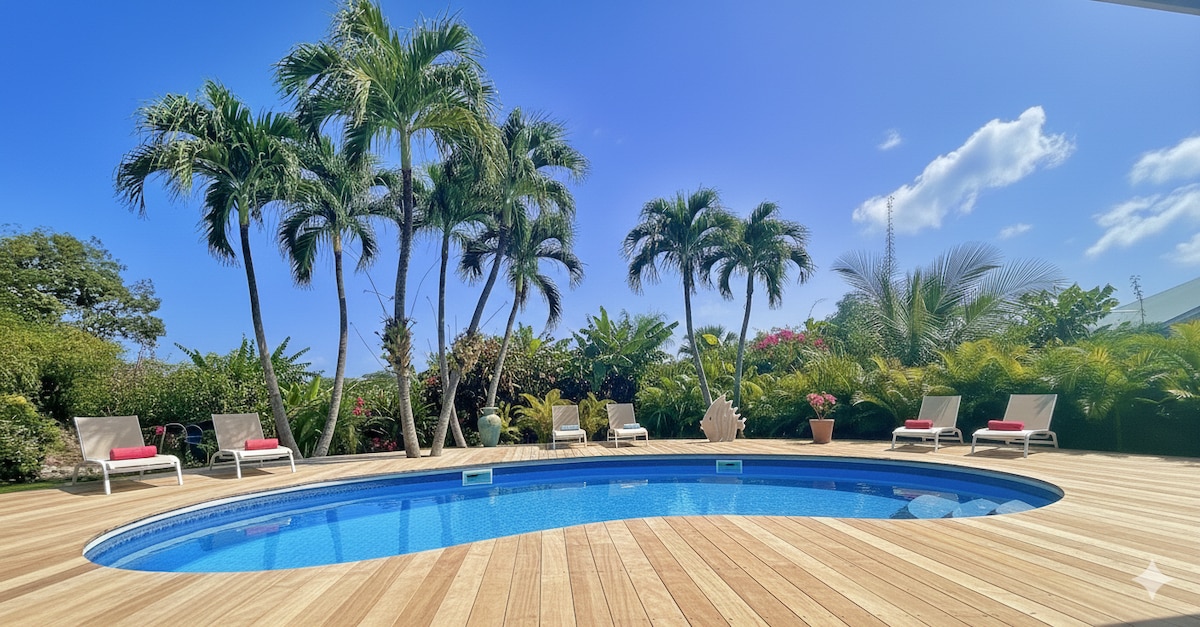 Tinatanaw ang golf at lagoon, sa isang maliit na gated residence malapit sa sentro ng lungsod at mga beach, masayang tinatangkilik ng magandang Creole villa na ito ang permanenteng impluwensya ng trade winds. Masarap pumasok sa kahanga - hangang katedral nito na sala na bukas sa malaking outdoor terrace. Moderno, kumpleto sa kagamitan at kumpleto sa kagamitan ang kusina na may dalawang bar nito.