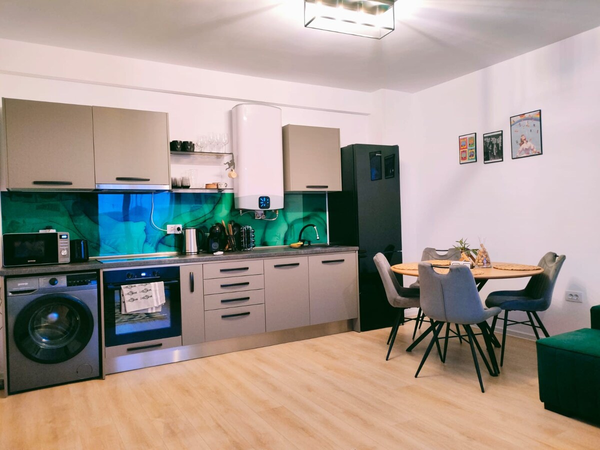 Enjoy an amazing experience at this modern place, located in a new building just 3 minutes away from the Aquapark President, very spacious and bright with an open balcony. Our apartment is perfect for families or couples, up to 6 guests due to our two matrimonial beds and one lovely sofa bed. The location offers you very quiet accommodation close to the Felix forest.