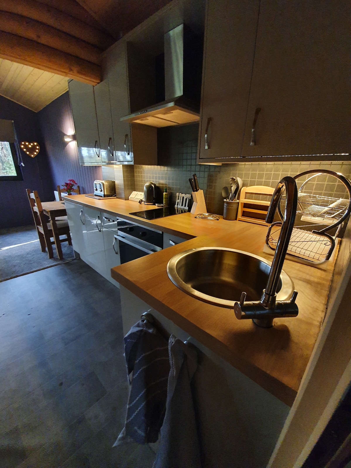 Magandang natatanging log cabin sa pribadong kagubatan, na matatagpuan sa tabi ng lawa at literal na mga batong itinatapon mula sa nakakabighaning lawa. May signal ng telepono at 4G ngunit walang Wifi kaya ang lugar na ito ay tulad ng isang retreat para sa iyo na tunay na magpahinga at magrelaks, o gamitin bilang isang base para sa paggalugad ng mga nakamamanghang lugar ng Yorkshire Dales at ang Lake District. Dalawang minuto mula sa J35 mula sa M6, napakadali nitong makarating sa at makapunta rin sa ibang lugar! Mayroon ding magandang canal walk mula mismo sa iyong log cabin papunta sa lokal na pub.