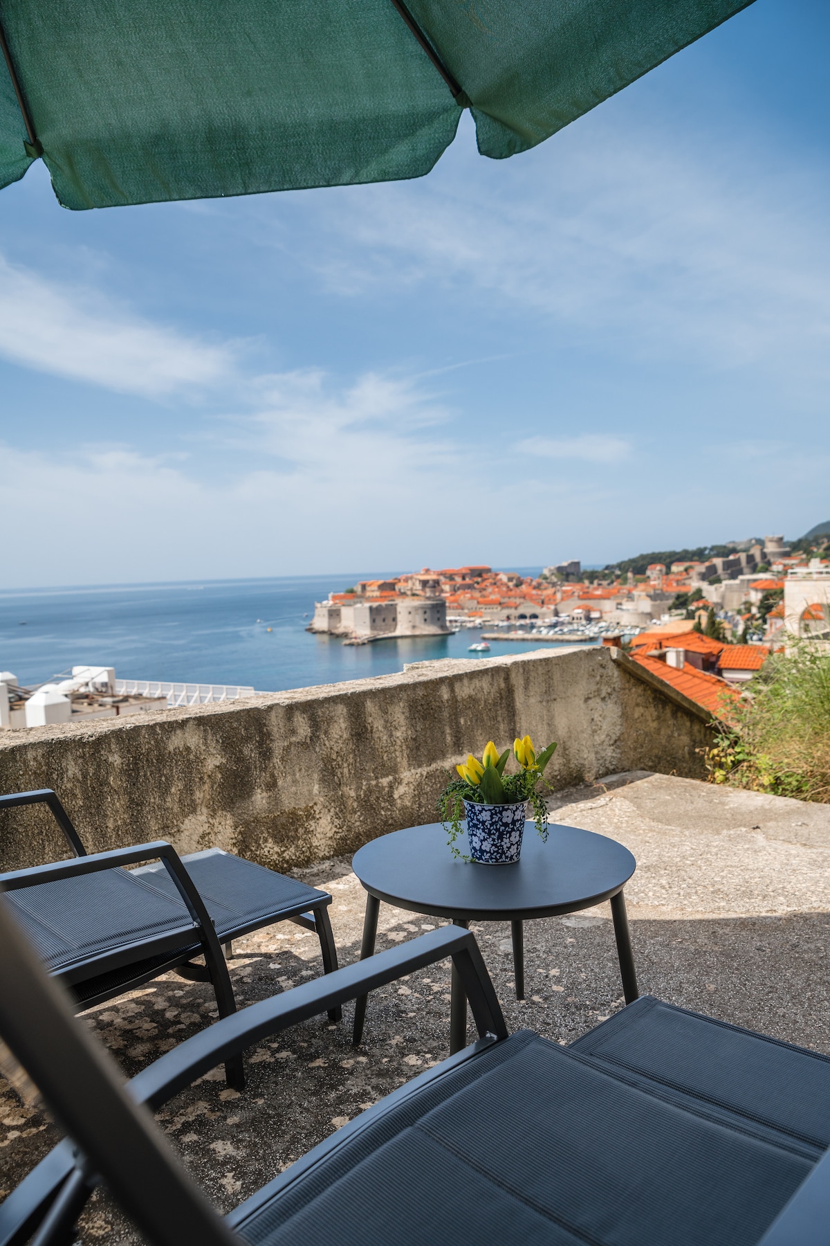Ang aming apartment ay isang komportableng studio apartment na 25 sq.m. (237 sq ft.). Apartment ay may 1 silid - tulugan na may 1 double bed na kung saan ay talagang dalawang twin bed ang isa ay sa tabi mismo ng isa. Maliit na kusina (2 hotplate) na may hapag - kainan. Banyo w/ shower/ en - suite/WC. Napakalaking PRIBADONG terrace (100 sq.m. o 1075 sq ft.) na nakalaan para lang sa iyo, na nag - aalok ng mga nakamamanghang tanawin ng dagat, Lumang Lungsod, Isla ng Lokrum. Para sa mga bisitang darating na may kotse, may kasamang paradahan nang libre sa aming pribadong paradahan.