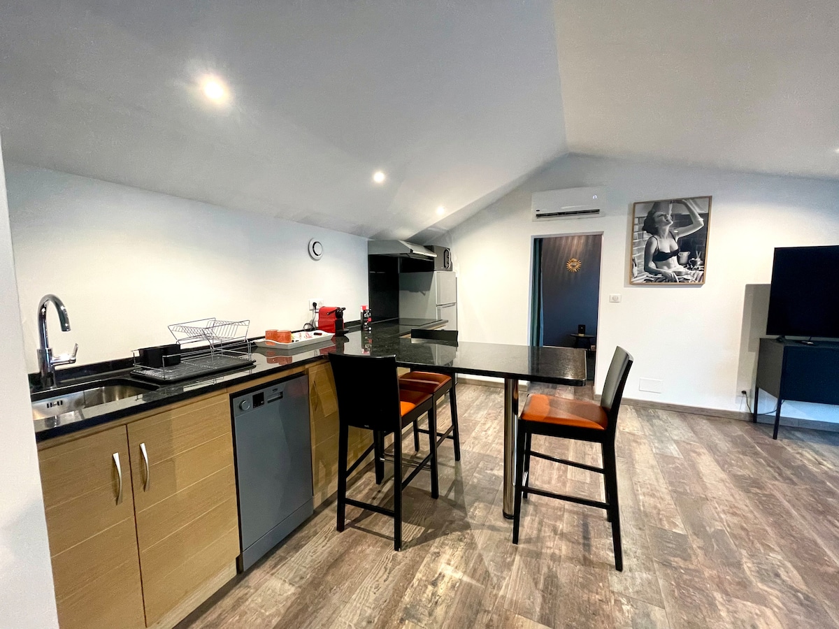 Modernong 34 m² suite sa downtown Limoges. Nag‑aalok ito ng komportableng sala, hiwalay na kuwartong may video projector at malaking 100‑inch na screen para sa mga pelikula sa gabi (kasama ang NETFLIX), queen size na higaan (160), modernong banyo, at pribadong terrace. Napakabilis at matatag na Wi-Fi connection na mainam para sa pagtatrabaho nang malayuan at pagbibiyahe para sa negosyo. Sariling pag‑check in, kaginhawa, at mga mamahaling amenidad. Pampublikong bayad na paradahan sa malapit.