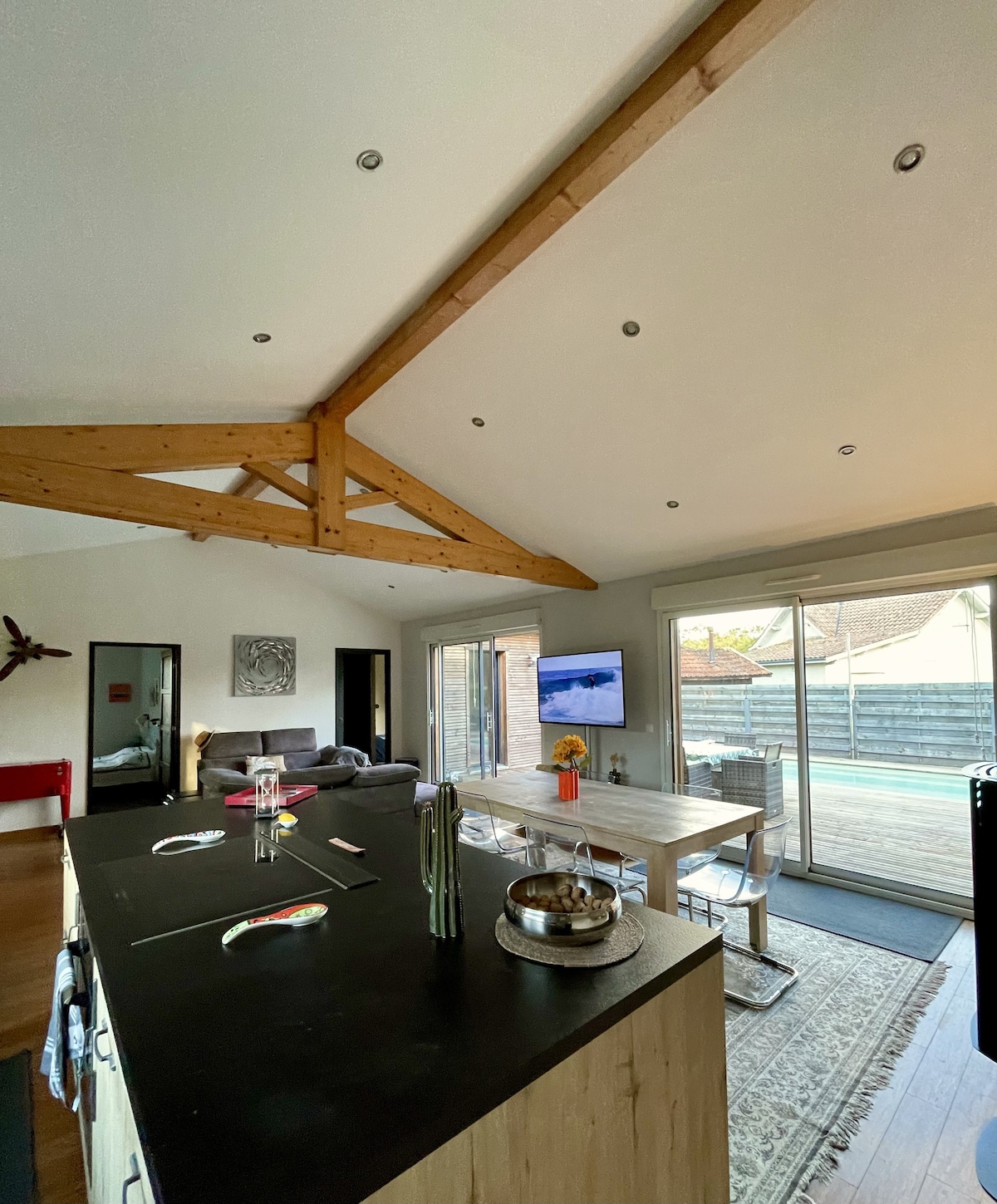 Isang tahimik na villa na may pribadong pool, na matatagpuan sa pagitan ng Bordeaux at Lacanau Océan. Mainam para sa bakasyon kasama ang pamilya o mga kaibigan, may hardin, maaliwalas na living space, at lahat ng modernong kaginhawa ang bahay na ito. Malapit sa mga beach sa Atlantic, mga daanan ng bisikleta, Landes forest, at mga outdoor activity. Ang perpektong lokasyon para magrelaks, mag-enjoy sa karagatan, at mag‑explore sa rehiyon ng Bordeaux.