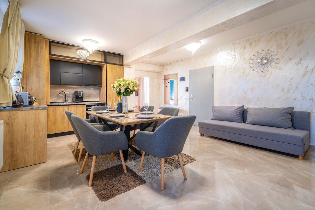 A uniquely and carefully designed, this apartment perfectly combines coziness with stunning Scandinavian accents. Situated in a new residential neighborhood, we go above and beyond to ensure a unique experience for our guests. Our home can accommodate up to 4 people and has its parking lot. The standout feature of this penthouse is the spacious terrace with a jacuzzi and a panoramic view over the mountains, being ideal for couples, business travelers, solo adventurers, or families (with kids).