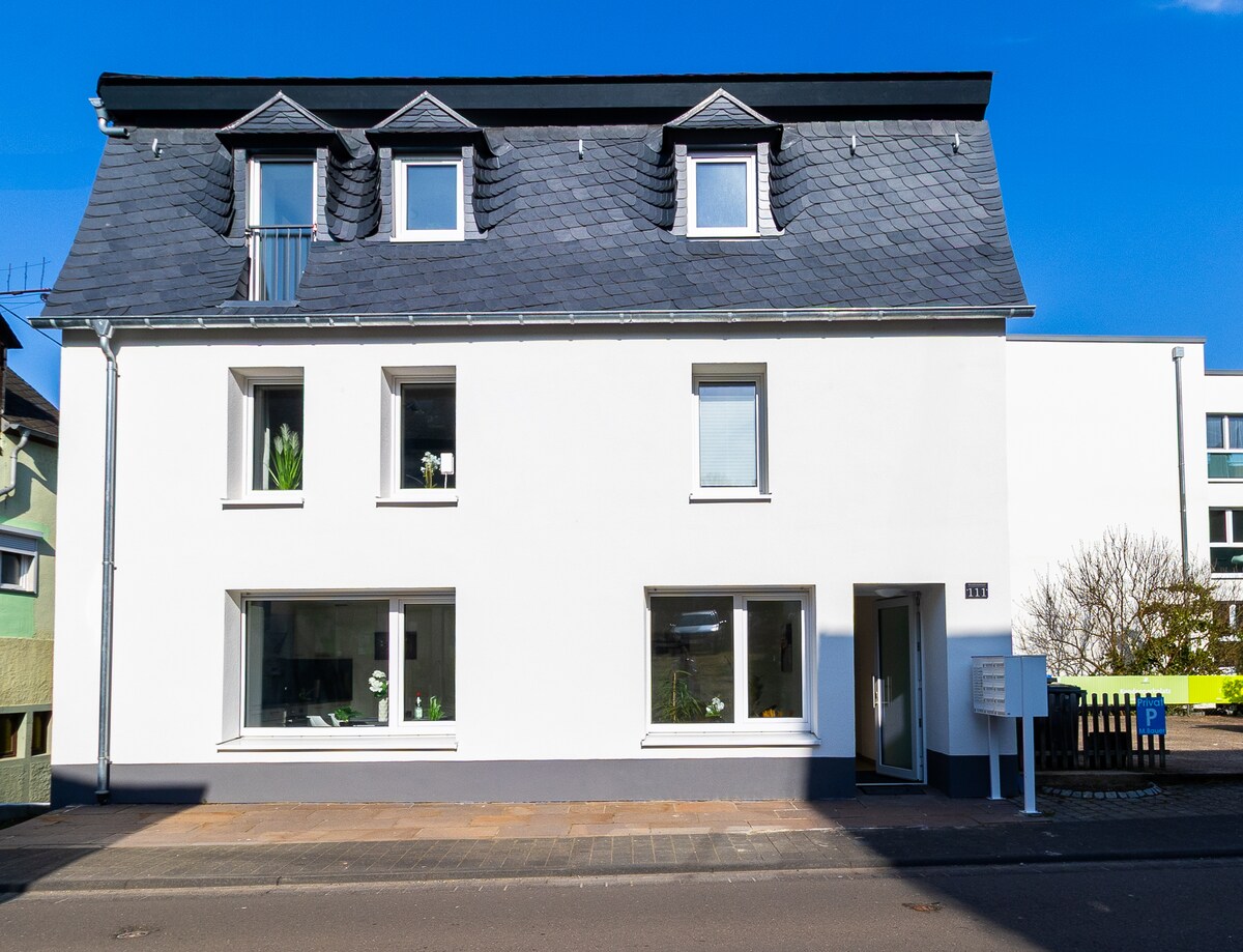 Naka - lock na apartment sa unang palapag ng aming bahay. Ang sala ng Smart TV (Sky, DAZN), TV sa mga silid - tulugan, kumpletong kusina na may dishwasher, sofa ay maaaring gamitin bilang sofa bed para sa isang tao, sakop na balkonahe kung saan matatanaw ang taas ng Mosel, bisikleta, garahe ng motorsiklo, mga higaan ng sanggol at mataas na upuan kapag hiniling, palaruan, daanan ng bisikleta nang direkta mula sa bahay, paradahan, mga supermarket 800 m, daan papunta sa lungsod nang walang pag - akyat, malugod na tinatanggap ang mga bata! Bayarin ng bisita/card ng bisita sa presyo incl.