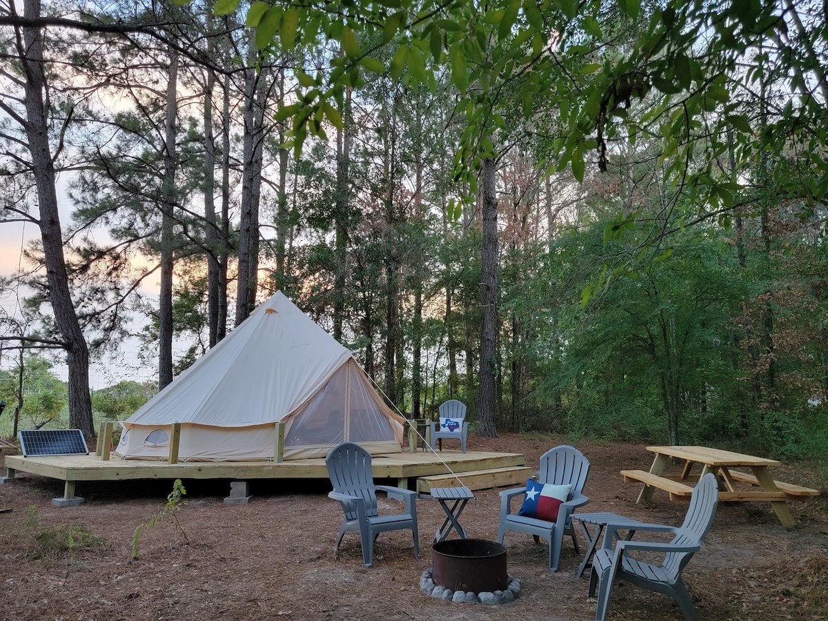 Welcome to the Happy Place at Outpost 203, Plantersville, TX! This 16-foot glamp tent on wood platform (with electric, A/C, heat, queen bed/futon/queen blow up mattress, bedding/decor) will surely take the hassle out of camping. Sleeps up to 6. It even has a k-cup coffee machine! Come "rough it" with us at our primitive camp in farm & ranch country. 7 miles to the TX Renaissance Festival entrance. 40 minutes NW of the Greater Houston area. Where the TX Hill Country meets the Piney Woods Region.