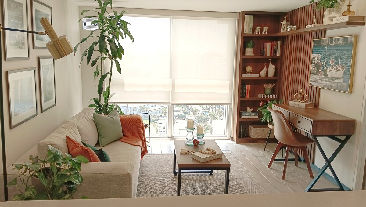 100% maganda dinisenyo sa pamamagitan ng Balance︎ño, na matatagpuan SA PINAKAMAHUSAY na lugar ng Miraflores, Kennedy Park area kung saan mayroon kang LAHAT NG BAGAY sa pamamagitan ng maigsing distansya, Larcomar, pinakamahusay na restaurant, sobrang merkado, tradisyonal na merkado, handcraft market, 24hrs groceries at 24hrs food stop! Ang lokasyong ito ay mayroon ding swimming pool, functional gym, 1 libreng paradahan sa loob ng gusali at mahusay na koneksyon sa sistema ng pampublikong transportasyon.