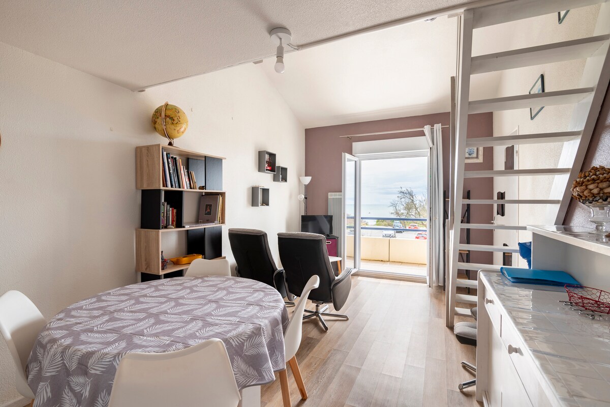 Ganap na inayos na inayos na T3 (katapusan ng 2021) ng 45 m2 sa ika -1 at pinakamataas na palapag, para sa 4 hanggang 6 na tao, na may tanawin ng dagat sa gilid at 1 pribadong espasyo sa paradahan, sa isang maliit, tahimik at mabulaklak na tirahan. May kasamang 1 pasukan na may mga aparador, 1 maliit na silid - tulugan, 1 malaking maliwanag na sala na may tanawin ng dagat, maliit na kusina at sofa, 1 maliit na shower room na may WC, 1 mezzanine (silid - tulugan na 2 na may 1 kama at 1 BZ) na sarado ng mga blackout na kurtina. Kagamitan: LL, LV, induction table, oven, microwave, refrigerator - freezer, TV.