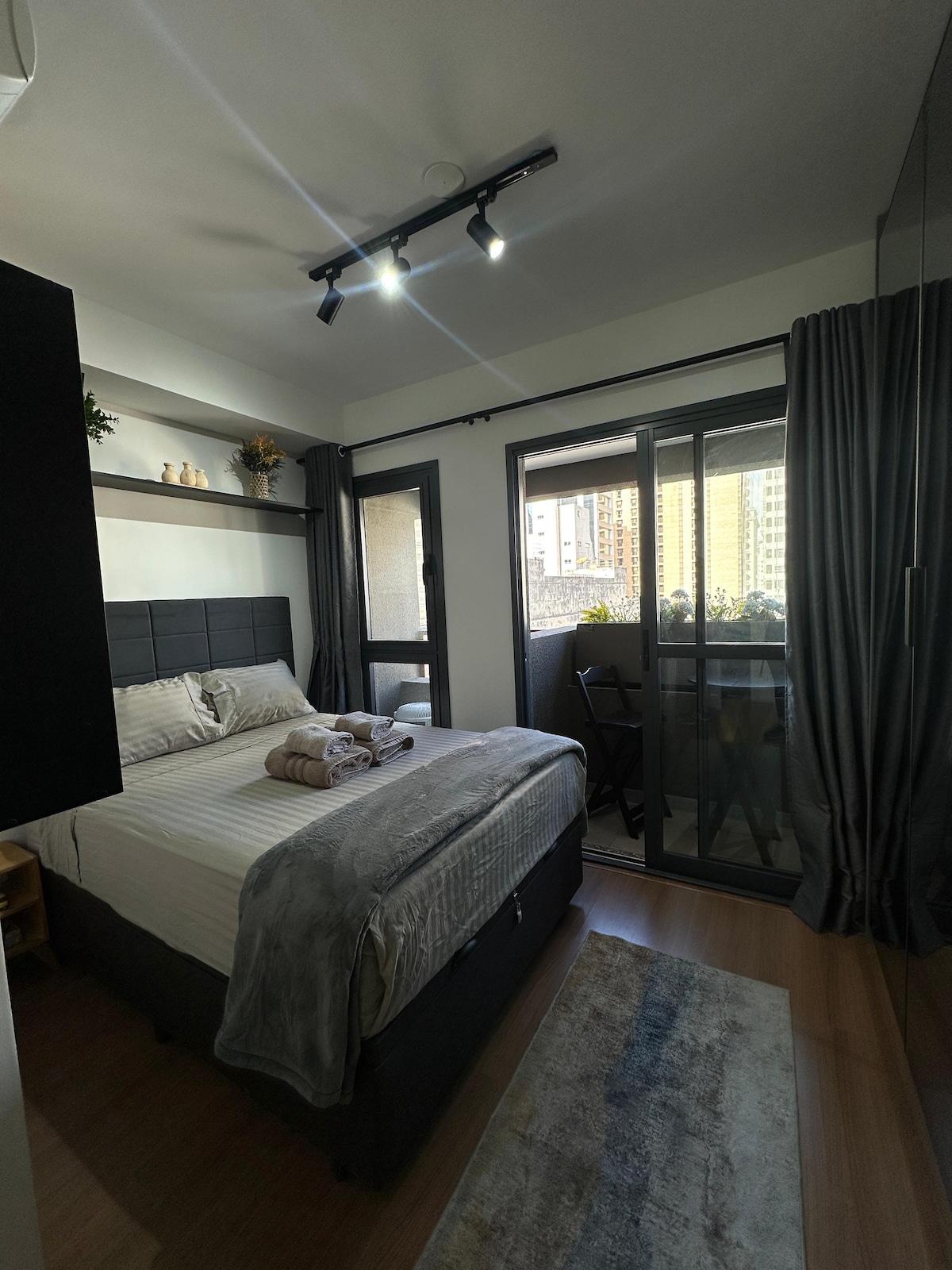 Estúdio moderno e ensolarado com cama queen size