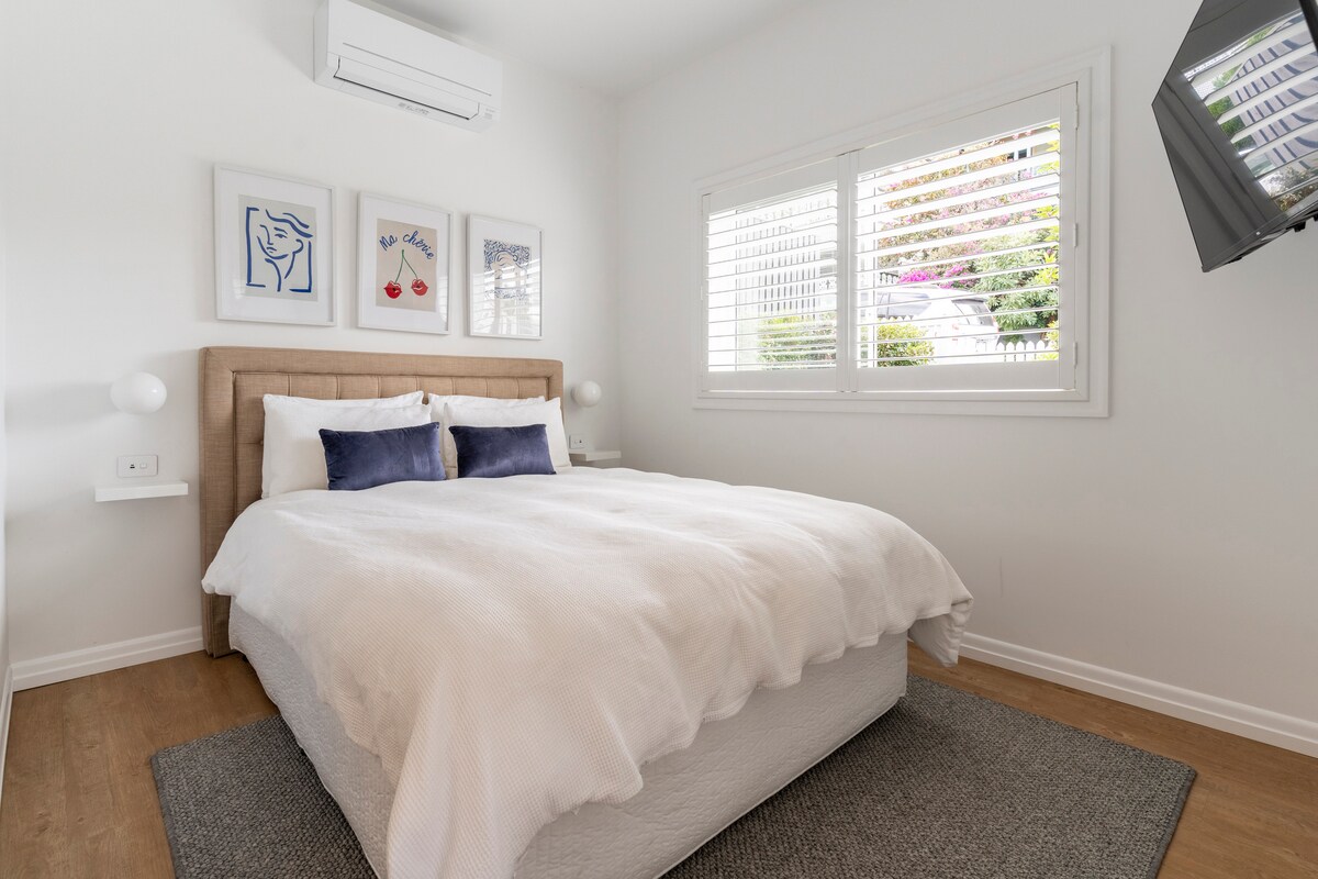 Pumunta sa iyong pribadong bakasyunan sa komportableng guesthouse na may dalawang kuwarto na ito. Magugustuhan mo ang balkonahe sa hardin, na perpekto para sa pag - inom ng kape sa umaga o pag - enjoy sa isang baso ng alak sa gabi. 10 minutong lakad lang, makakahanap ka ng iba 't ibang kaaya - ayang restawran, cafe, at boutique grocery store, na nagdaragdag sa kaakit - akit ng masiglang kapitbahayan. Ginagawa itong perpektong tuluyan na malayo sa bahay dahil sa kumpletong kusina, labahan, at 2 komportableng kuwarto. I - book ang iyong pamamalagi ngayon at gumawa ng mga alaala sa idyllic retreat na ito.