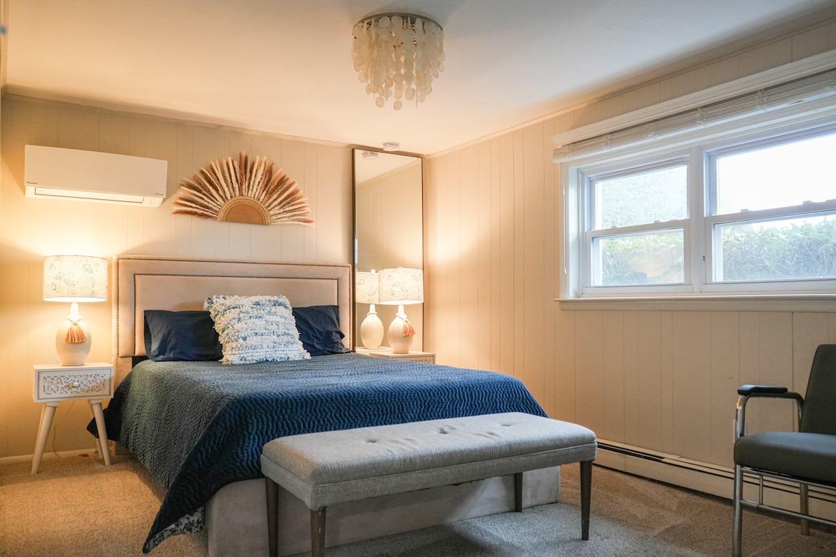 Ang Serenity Suite ay isang functionally dinisenyo, bukas na konsepto, mas mababang antas ng espasyo na may sarili nitong PRIBADONG pasukan, kusina, silid - tulugan, banyo at mga seating area. Sa pamamagitan ng malinis na kontemporaryong disenyo at mga muwebles, nagbibigay ang The Serenity Suite ng komportableng, tahimik at ligtas na kapaligiran. I - unwind at magrelaks, sa bagong inayos na suburban Suite na ito na matatagpuan 10 minuto mula sa UBS Arena at Belmont Park, 5 minuto mula sa Belt at Southern State Parkways, 15 minuto mula sa JFK, 10 minuto mula sa LIRR at 25 minuto mula sa LGA.