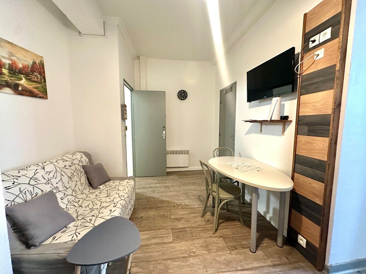 Tangkilikin ang naka - istilong, maliwanag at gitnang 60m2 na bahay na may 20m2 outdoor terrace. Ganap na naayos, ito ay komportable at magandang lokasyon. Binubuo ito ng 1 silid - tulugan na may 1 kama 160x200 at sofa bed 140x200. Ang kusina ay kumpleto sa washing machine at dishwasher, microwave, coffee maker,... Nasa maigsing distansya ang downtown, mga tindahan at restawran sa loob ng wala pang 10 minuto Ang istasyon ng tren ay 10 minutong lakad ang layo. Ang labasan ng highway ay 3 minuto sa pamamagitan ng kotse.