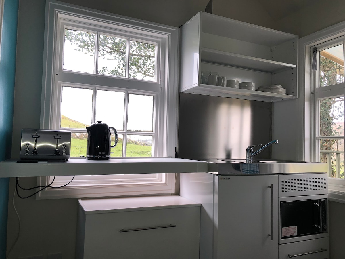 May timpla ang turf covered cabin na ito ng Viking longhouse at underground hobbit hideaway. Nasa magandang lugar ito sa aming halamanan sa pagitan ng mga bundok at dagat sa aming maliit na permaculture farm. Maranasan ang camping fire cooking, at malinaw na maliwanag na kalangitan, habang may komportableng kama, kusina, mainit na tubig, shower compost toilet at wood - burning stove para maging kumportable ang pag - ikot kung malamig. Lahat sa aming sustainable na ecological farm na may mga lawa, kakahuyan at mga hayop para mahanap at ma - explore.