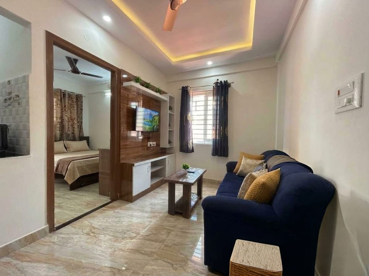 Isa itong komportable at functional na 1BHK na matatagpuan sa isang residential apartment sa BTM Layout 2nd Stage. Angkop ito para sa mas matatagal na pamamalagi at mga bisitang nagpapahalaga sa praktikal na pagkakaayos ng tuluyan na may magagamit na kusina para sa regular na pagluluto ng Indian. Dahil ito ay isang gusaling tirahan na may ibang nakatira, dapat asahan ng mga bisita ang mga karaniwang ingay sa lungsod at dapat nilang asikasuhin ang pangunahing kalinisan at pagtatapon ng basura sa panahon ng kanilang pamamalagi.