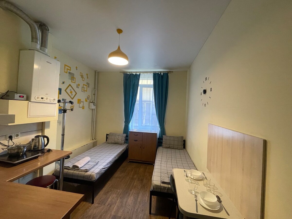 В студии есть диван при раскладывании которого получаем полноценное двуспальное место. При необходимости можем предоставить дополнительно евро-раскладушку. Зона кухни: небольшой холодильник, электро-чайник, мультиварка. Санузел: душ, унитаз и умывальник. Бесплатно предоставляем постельное белье и полотенца. В общем коридоре: стиральная машинка, утюг и гладильная доска, которой можете бесплатно воспользоваться. Рядом магазины, аптеки, кафе, автостоянка и инфраструктура для комфортного проживания