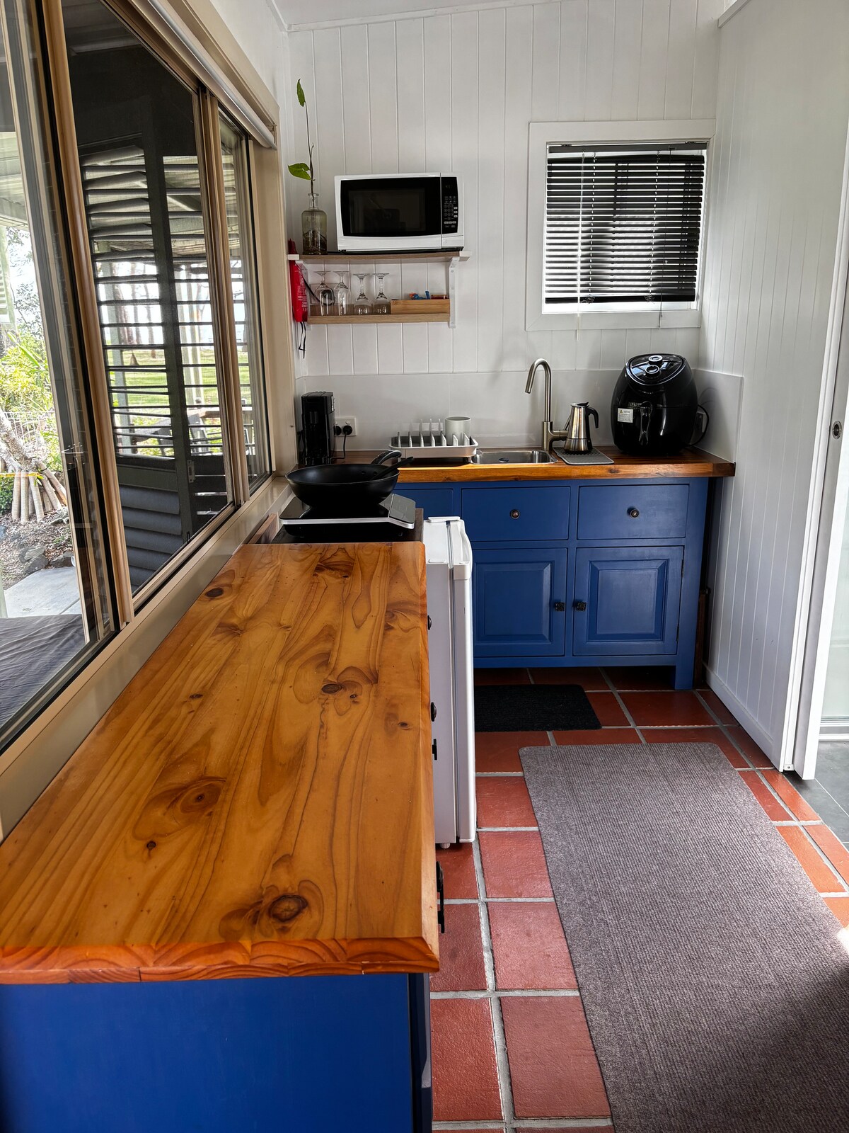 Nag - aalok ang pribado at maluwang na kuwarto ng queen bed, kitchenette, at sofa na may accessible na banyo. Sa labas ng patyo, tinatanaw ang bush land at Burnett River na may upuan at bbq. 10 minuto papunta sa shopping center at mga restawran, 15 minuto papunta sa Bundaberg CBD. Tandaan na walang Wi - Fi, ngunit mayroon kaming Telstra at Optus reception at maaari kang mag - hotspot sa TV para sa mga serbisyo ng streaming. Hindi namin pinapahintulutan ang mga aso sa lugar, para ito sa kanilang kaligtasan dahil hindi ganap na nakabakod ang aming property.