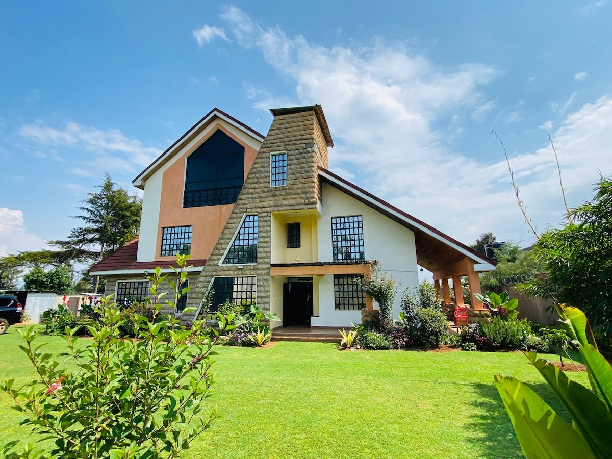 Kami 's Place ~ Isang Bagong Paraan ng Pamumuhay sa tahimik at magandang Mountview, Kitale. Ang Kami's Place ay isang moderno at magandang idinisenyong residensyal na Villa na nakaupo sa 1/2 acre, 2.5 kilometro mula sa Kitale Airstrip sa kahabaan ng Kitale - Webuye highway. Kabilang sa mga Pangunahing Tampok ang: Kumpleto sa Kusina, Nilagyan ng gym na may TV Screen , Hardin na may BBQ area, 24 - oras na manned Gate, CCTV Surveillance, Solar Water Heating, 4 en - suite Bedrooms, 2 Fire place, study room, WiFi, DStv, washing machine, at stocked bar.