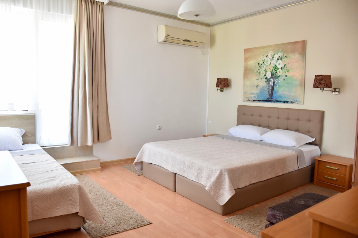 Magrenta ng mga apartment sa tabi ng dagat sa Bulgaria - naghihintay sa iyo ang pinakamagagandang alok! Mga komportable at maliwanag na kuwarto sa isang guest house sa Ravda: dalawang single bed, air conditioning, TV, lugar ng trabaho at balkonahe kung saan matatanaw ang berdeng patyo. 15 minutong lakad lang papunta sa dagat! Walang tagapamagitan at hindi kinakailangang abala - pumili ng komportableng matutuluyan para sa buong pamilya o grupo ng mga kaibigan. Bukas kami sa mga bisitang may mga alagang hayop! Puwedeng magrelaks kasama mo ang iyong mga alagang hayop.