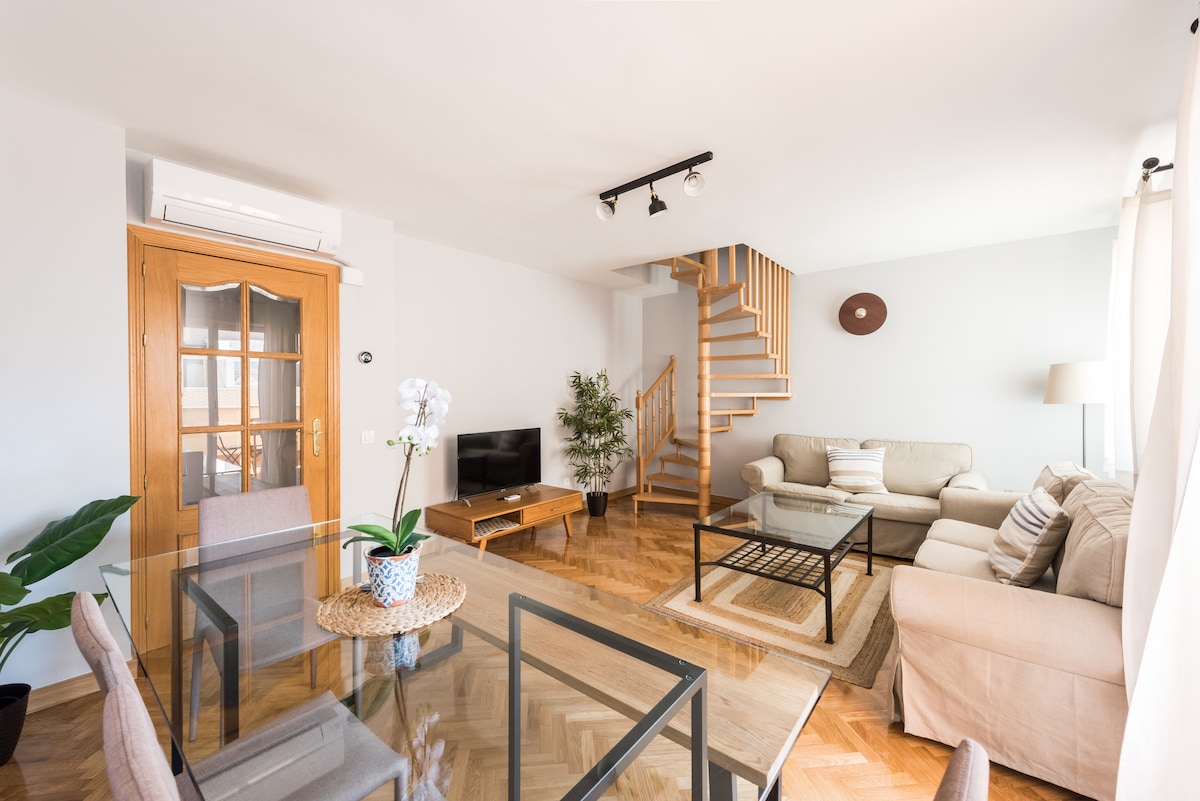 Magandang duplex sa sentro ng lungsod ng Madrid na may dalawang terraces, sobrang lawak at may mga naglo - load ng sikat ng araw. Kamakailang na - facelift at redecorated na may modernong, pang - industriyang estilo, AC sa lahat ng kuwarto, swimming pool (mula sa kalagitnaan ng Hunyo hanggang kalagitnaan ng Setyembre) at panloob na paradahan na kasama sa presyo ng pag - upa sa panahon ng lahat ng iyong pamamalagi. Napakahusay na mga komunikasyon sa pampublikong transportasyon upang makapunta sa makasaysayang sentro ng lungsod sa loob ng 15 -20 minuto. Tangkilikin ang Madrid habang namamahinga tulad ng bahay sa isang tahimik na lugar ng tirahan sa kabiserang lungsod.