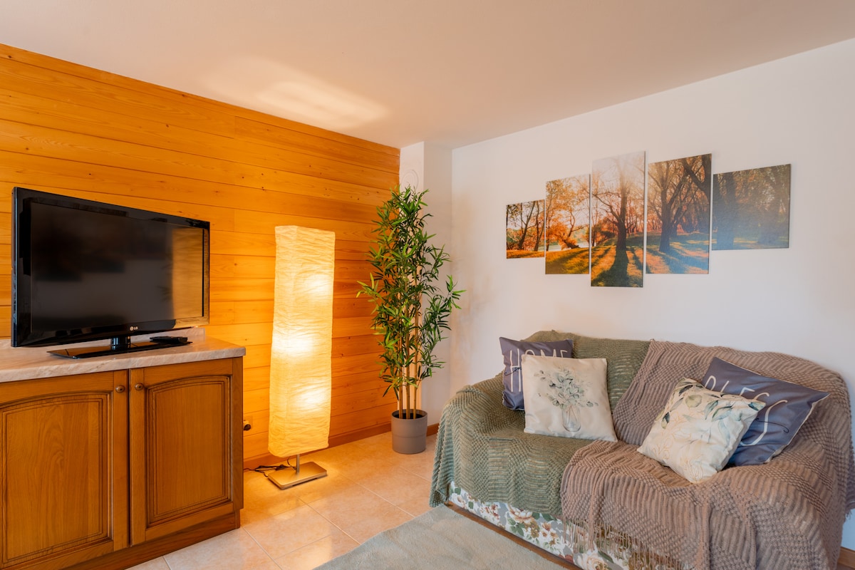 Maligayang pagdating sa aming tuluyan! Ang tuluyan ay isang apartment sa unang palapag sa isang bahay na may 2 yunit, na binubuo ng pasukan, sala na may sofa bed, smart TV (netflix at first videos), wifi, wood-burning stove, at bagong kusina na kumpleto sa kagamitan. Dishwasher, coffee maker, microwave. Inayos na banyo, bintana, na may malaking shower. Double room na may guard at container bed. Malaking pribadong hardin, posibilidad ng barbecue. Pribadong paradahan. Napakalapit sa bayan