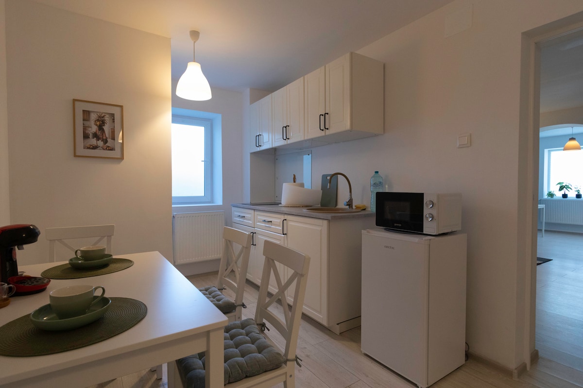 Beautiful and spacious apartment located in the center of Buzau, very close to Piata Daciei / Winmarkt (4 minutes walking)! Our property has one bedroom, 2 bathrooms, one big livingroom with a big convertible sofa,open kitchen and a big glass table for 6 people. The apartment is equipped with air conditioning, a refrigerator, a microwave, some kitchen utensils, and a stove. Parking is always available on the street