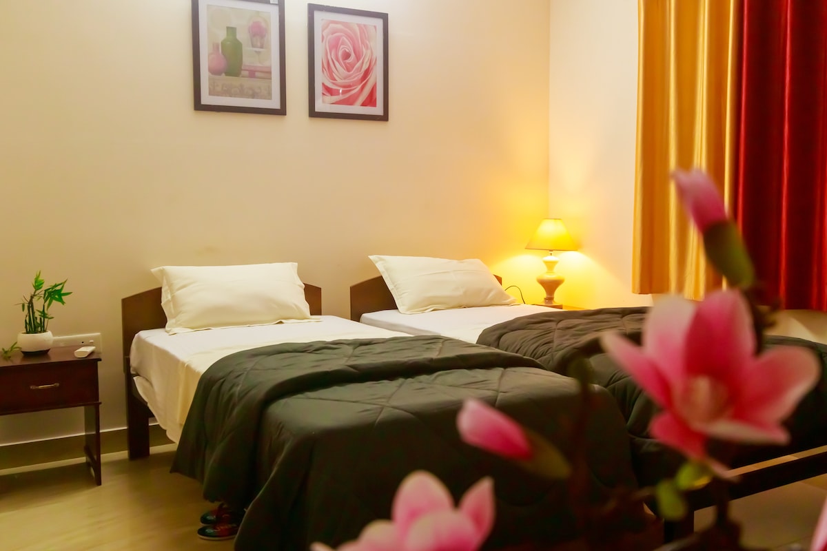 Experience our brand new, premium Studio Room, ideal for couples and travellers seeking comfort and privacy in a convenient location. The bedroom has a king bed with soft orthopedic mattress for a restful night's sleep. Features an Air Conditioner, 43-inch Smart TV, lightning-fast WiFi, and a dedicated work desk. Comes attached with a super clean bathroom that’s stocked with bath essentials. The building is equipped with a lift, security guard, 24-hour power backup and CCTV surveillance.