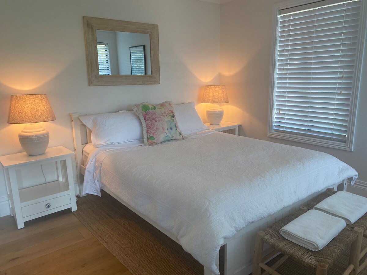 Isang tahimik na naka - istilong tuluyan. Idinisenyo para sa nakakaengganyong biyahero, na pinakaangkop para sa mga mag - asawa, walang kapareha o maliliit na pamilya na gustong masira sa magandang itinalagang studio space na ito. Gumising sa magandang natural na liwanag at sariwang ground coffee mula sa espresso machine, O maglakad papunta sa mga tindahan sa pamamagitan ng beach. May walang aberyang daloy mula sa labas papasok, na may alfresco bar na nag - uugnay sa patyo papunta sa kusina, na perpekto anumang oras. Sa wakas tapusin ang perpektong araw sa king bed luxury, na ginawa gamit ang pinakamagandang linen