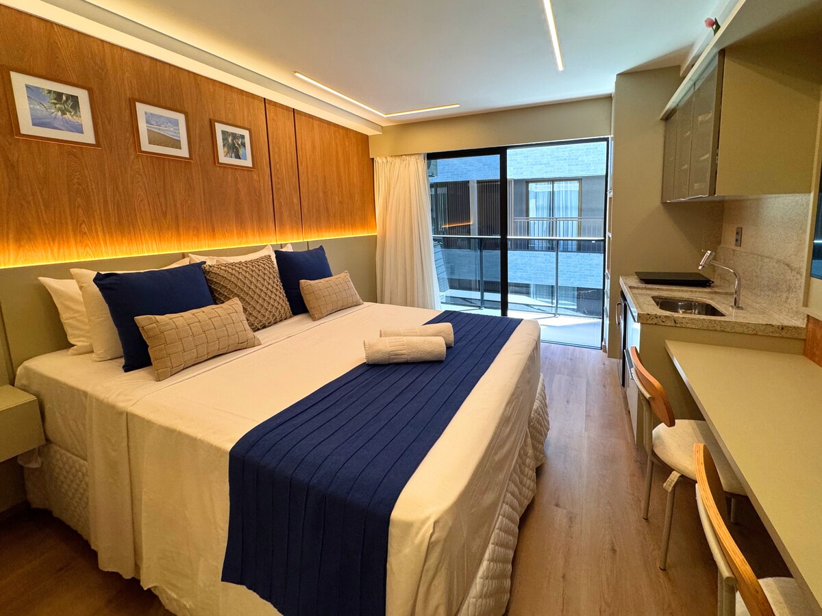 Flat na praia, com estilo, conforto e espaço lazer