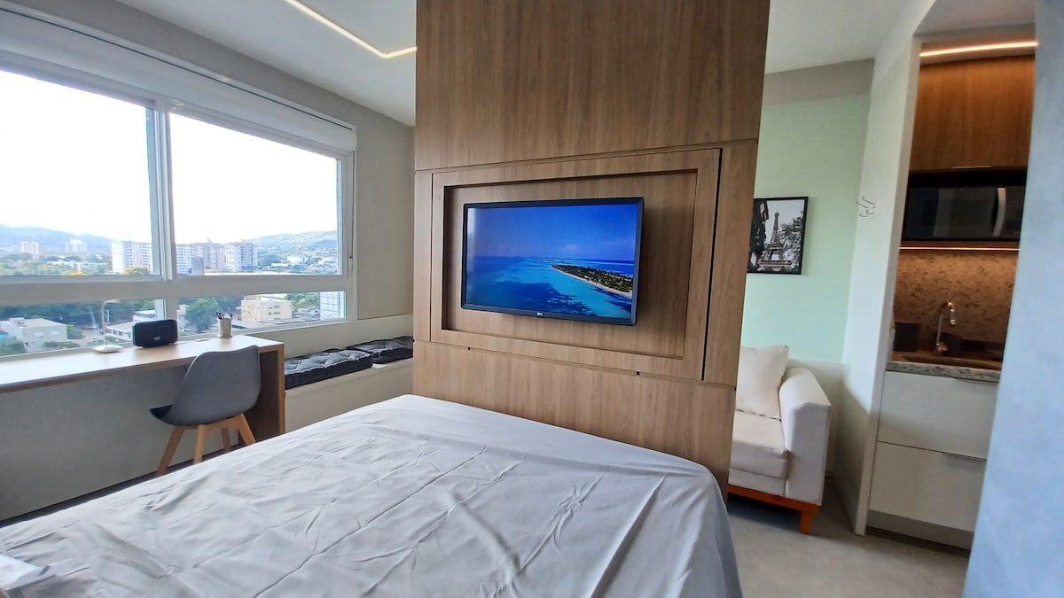 Bagong studio na 43sqm sa TREND CITY, kamangha-manghang tanawin (ika-16 na palapag) ng Guaíba Lake, Lake Shore, at Marinha Park, condominium na may kumpletong imprastraktura, 24 na oras na concierge, parking space, gym, at 20m heated pool. Queen size bed, space to work with laptop, hot and cold air - conditioning 24,000, Smart TV 50, cable TV NET HD with 250 channels, Wi - Fi 250 mbps, barbecue pit, wash and dryer machine, iron, hair dryer, microwave, airfryer, tag and electronic lock.