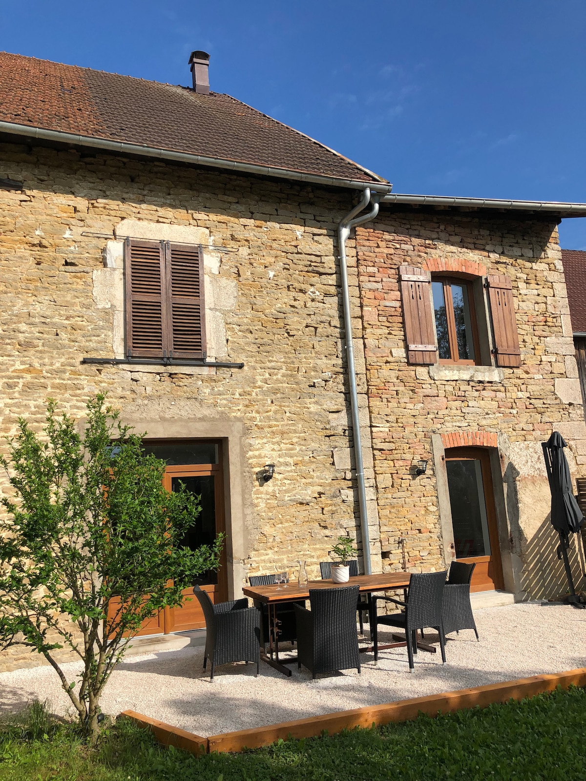 Appartement indépendant aménagé dans une ferme ancienne restaurée avec petite terrasse ombragée et accès au jardin dans village franc-comtois authentique. Idéal pour couple ou couple avec enfant et non recommandé pour un groupe d'adultes (manque d'intimité)