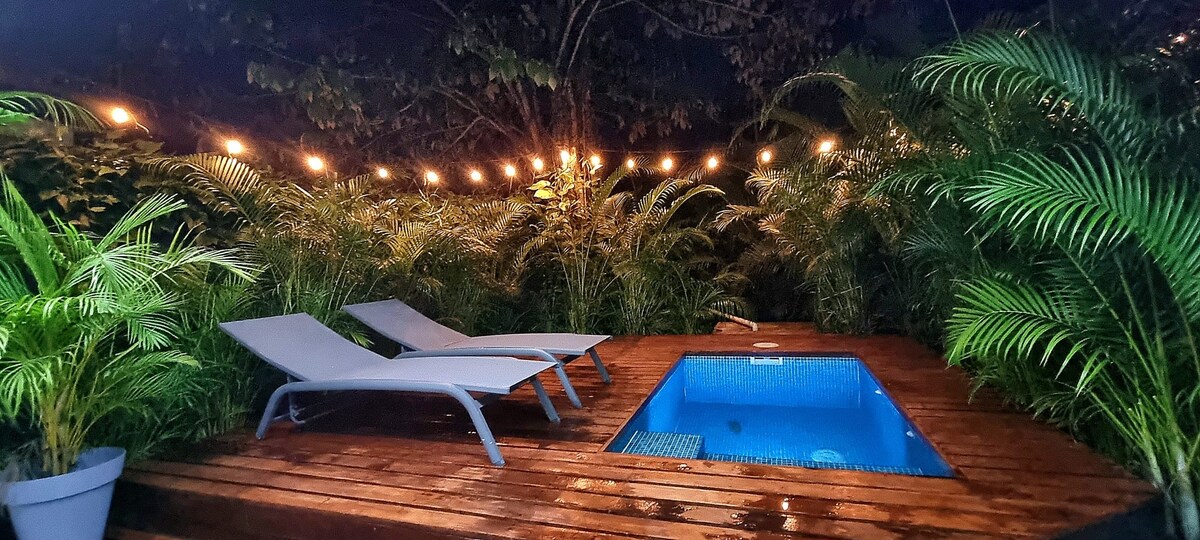Makikita ang layuning ito na itinayo ng Love Island themed casita sa mga tropikal na hardin, ilang minutong lakad mula sa pasukan ng National Park, village center, at ilan sa pinakamagagandang beach ng Costa Rica. Nagtatampok ang stand alone studio unit na ito ng A/C, sarili nitong pribadong plunge pool, nakalaang work space at 25mb na bilis ng wifi para sa mga digital nomad, modernong kusinang kumpleto sa kagamitan, naka - istilong bathroom suite, at off road private parking. Panoorin ang mga sloth, toucan at howler monkeys habang namamahinga sa iyong sariling marangyang dip pool!