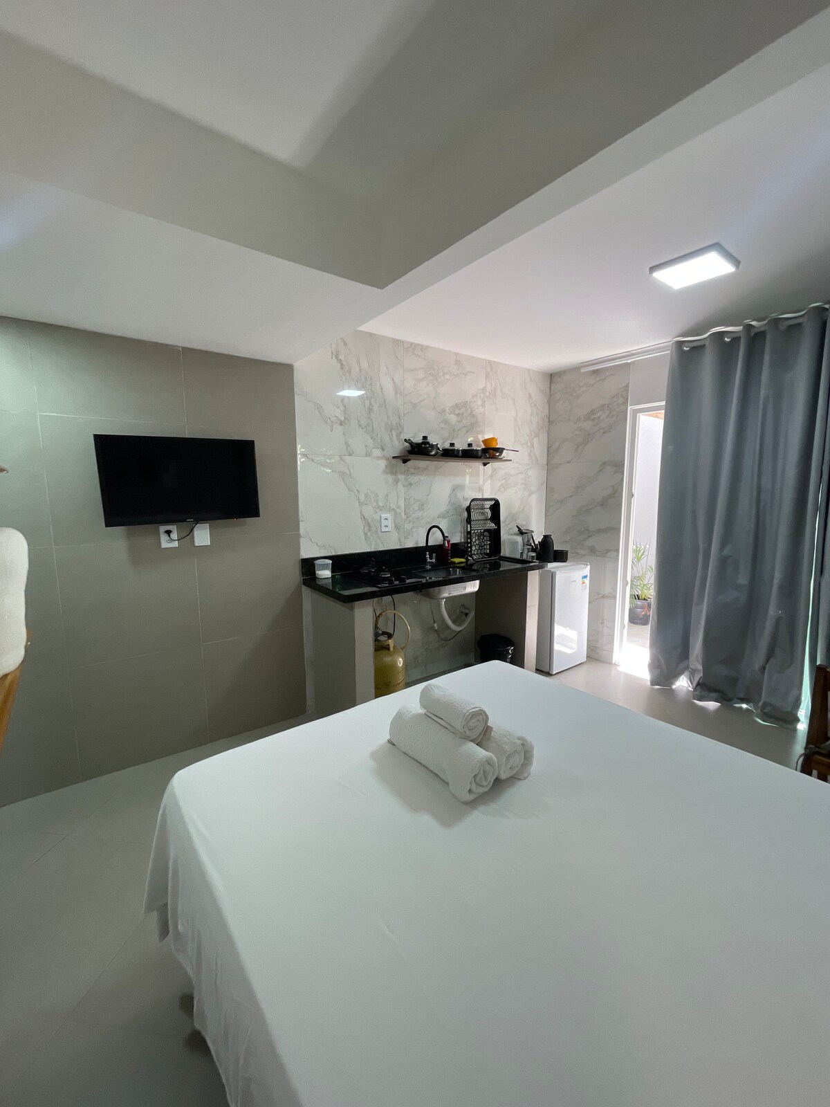 Nasa Mar Doce Lar Condominium kami, sa 2nd beach, malapit sa pinakamagagandang restawran sa Morro, 300 metro ang layo mula sa beach. Hanggang 4 na tao ang komportableng matutulog sa aming tuluyan. Mayroon kaming kuwartong may double bed at sa sala, futon sofa bed, napaka - komportable at maluwang. Nilagyan ang kuwarto at sala ng air conditioning at 4K TV. Mayroon tayong lahat ng kagamitan sa kusina, coffee maker, blender, sandwich maker, microwave, cooktop, refrigerator, iron at hairdryer. Available ang bed and bath linen.