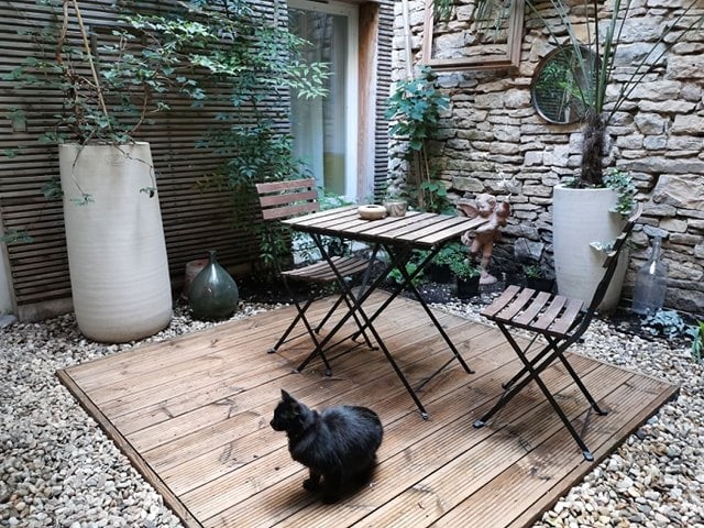 Sa gitna ng lumang nayon, mararamdaman mong tahimik na natutulog sa isang nakatirik na kubo! Ang tuluyan na ito ay matatagpuan sa ilalim ng aming patyo sa loob. Masisiyahan ka sa cool na stop na ito sa luntiang maliit na hardin na ito. Sa DRC, ang sala - kusina ay may lahat ng kailangan mo para makapagpahinga. Makakakita ka ng maliit na kusina para sa iyong mga pagkain (refrigerator, microwave, electric hob, coffee maker, babasagin...) sa isang chic bohemian at vintage ambiance.
